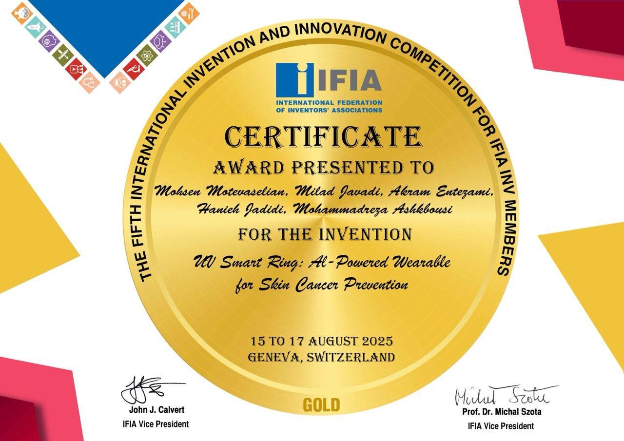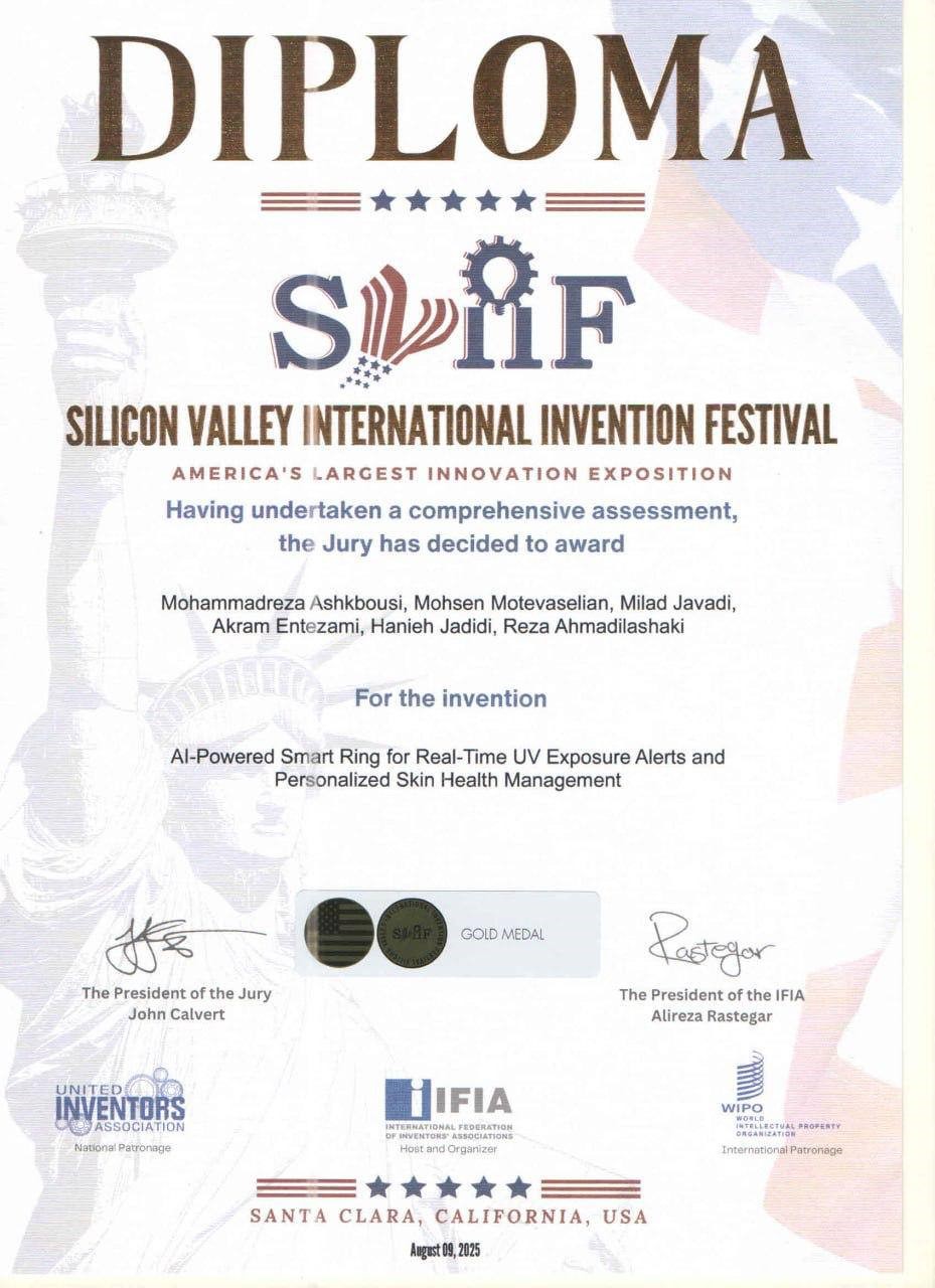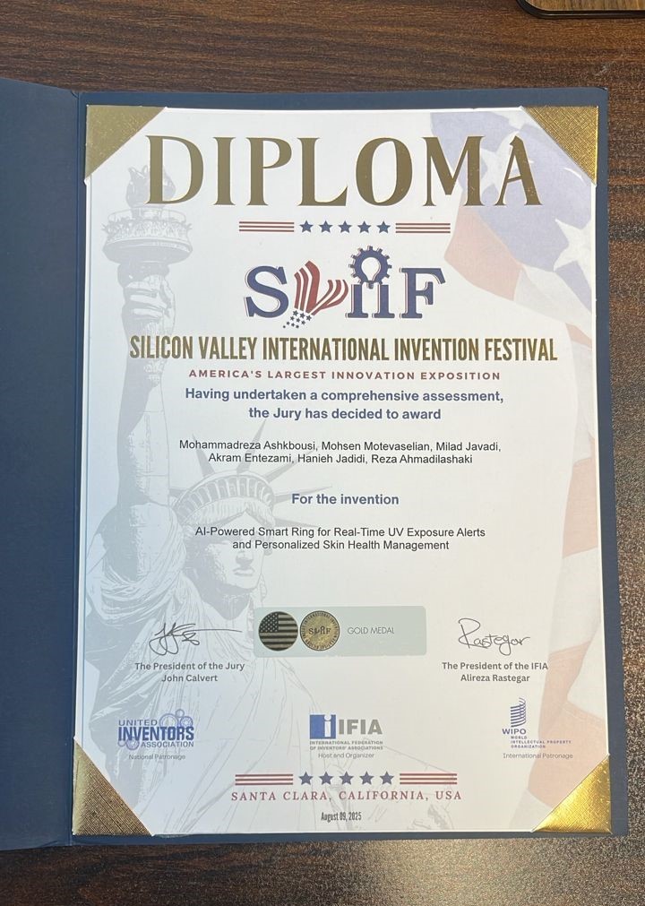 While his academic work deepened, Motevaselian’s inventive spirit led him outside the walls of the hospital. He conceived a device that could extend medical insight into daily life: a smart ring designed to monitor ultraviolet (UV) exposure and physiological data to predict the risk of skin cancer.